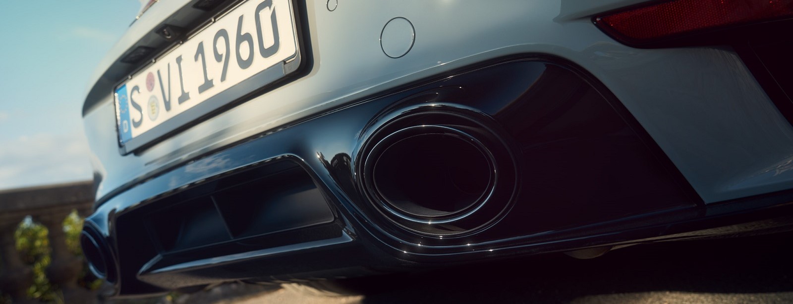 Hinweis: Bitte beachten Sie die kostenpflichtigen Zusatzumfänge gemäß Ein- und Umbauanleitung. Bei Einbau muss eine Herstellerbescheinigung bei Ihrem Porsche Partner angefordert werden. Die Aktivierung des Sport-Sounds erfolgt über eine separate Taste im Bedienfeld der Mittelkonsole. Das Ansteuern der Sportabgasanlage ist unter Umständen durch ein mechanisches Geräusch wahrnehmbar.